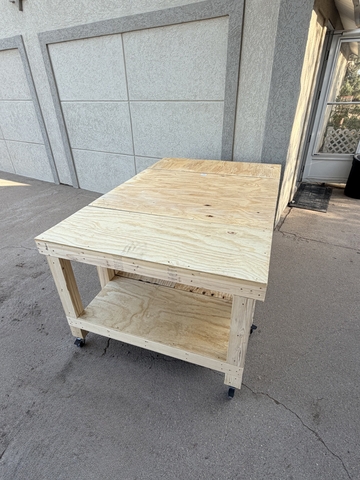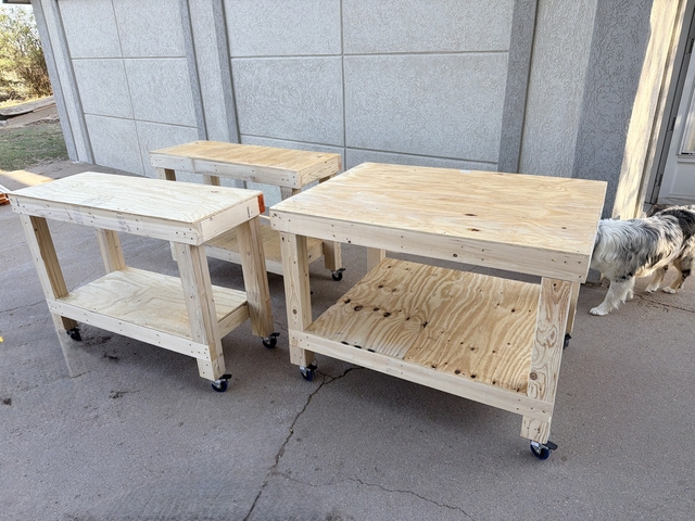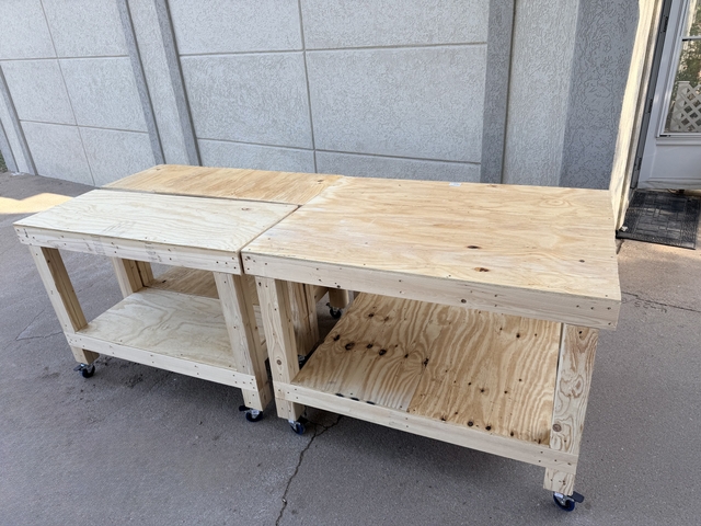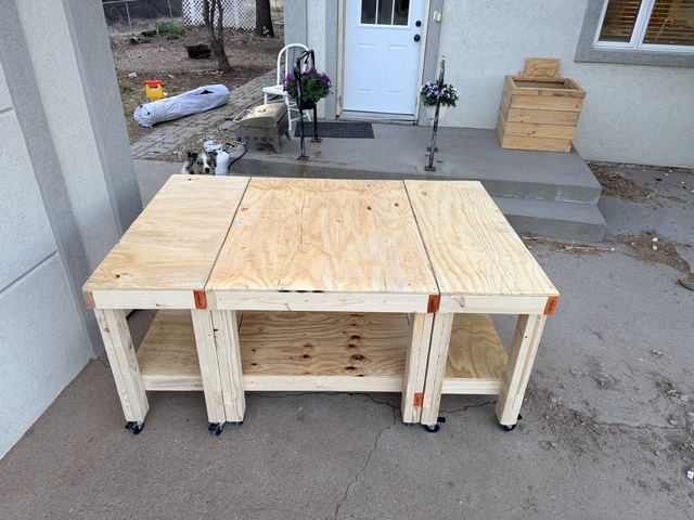 Heavy duty work bench. Just built! Has 125 lb 3 inch locking caster wheels. 3 tables that can make 1 big table. Asking 600 obo.text 620-214-8636 for more information