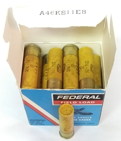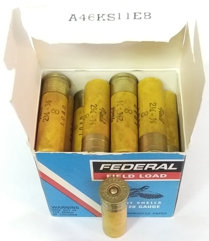 25 paper shotshells. Lot No. A46KS11EB. Measured shell length: 2.25". $1.60 / shotshell. Shotshells new, but in opened box. Box good condition. Unknown how ammo has always been stored, or how old it is. Sold as collectible ammunition. Clean.