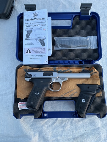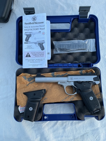 Smith & Wesson victory stainless.22 target pistol like new in box with rail and extra set of grips and papers...very nice piece...$475 or possibly trade for other firearms or possibly twords a decent vehicle...can trade up or down ...call or text 785-543-9010... I'm not on here much ... thanks