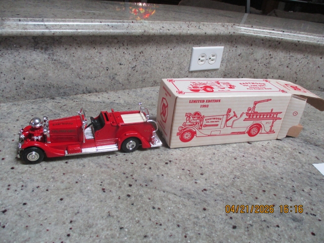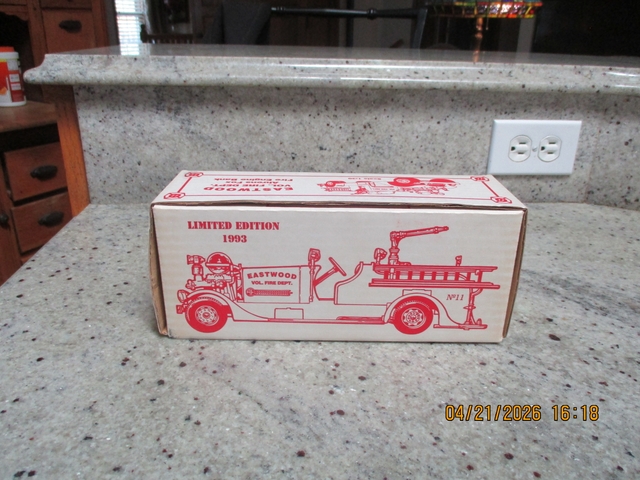 I have for sale a new die cast Eastwood Vol. Fire Dept. Ahrens Fox Fire engine bank with key nand I am askingn 30 dollars for it. Only taken out of box for pictures. If interested call 785-625-5110 or message me on Nextech.