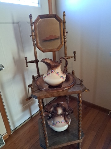Vintage wooden wash stand with mirror, 2 pitchers and basin. Cash only. Pick up in Hays. Contact me through Nextech Classifieds.