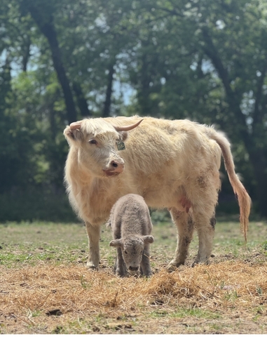 Millie is a white midsized highland cow she is unregistered and about three years old. She has had one calf and is a great mom and has had no troubles.