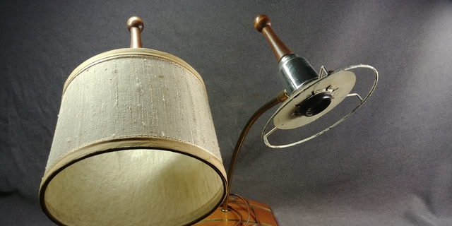The goose neck lamp has one shade that has a stain and the rim of the second shade