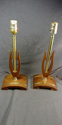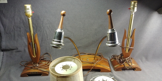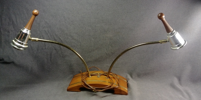 A original circa 1950's-60's mid century modern matching set of two end table lights and a goose neck double light by Mel Wheeler possibly of Kansas City.
