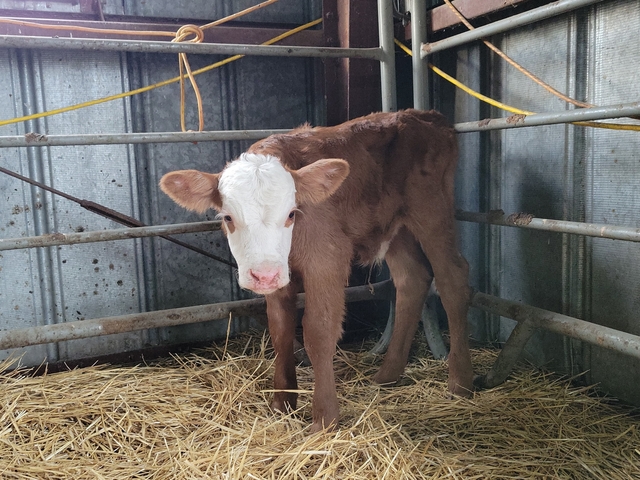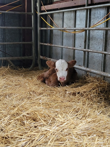 Red Angus/ Hereford Bull calf born 4/21.