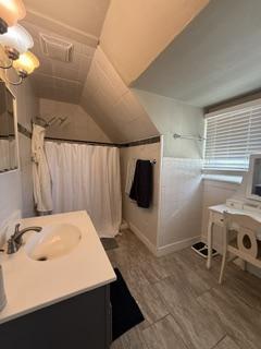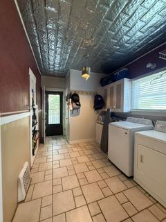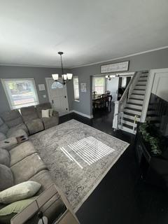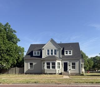 The welcoming cottage-style front porch with white railings sets the stage for this character-filled 1910 home, which is move-in ready. Step inside to find fresh interior paint, hardwood floors, and a generous layout highlighted by an impressive open staircase. The main level showcases a farmhouse-style kitchen with updated tile flooring, white cabinetry, and a spacious center island for additional storage and dining. The main floor also offers versatile living areas, including the option for a large bedroom with a walk-in closet, a laundry room, and a half bath conveniently located near the west door leading to the backyard.