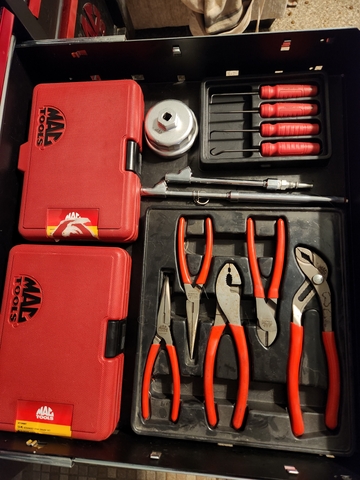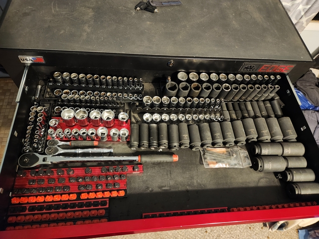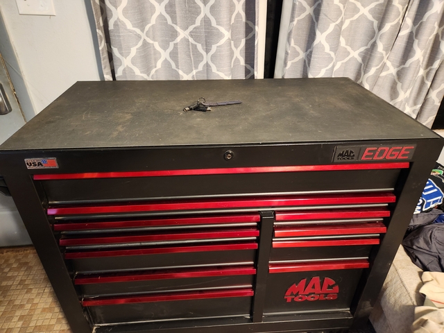 My fiance originally bought this for $15,000. It's rarely been used. This tool box comes with 2 sets of impact rated sockets (standard and metric), 4 sets of chrome sockets (standard), and 2 sets of chrome sockets (metric), 1 1/4 in ratchet, 1 3/8 in ratchet, 1 1/2 in ratchet, 4 pry bars of different sizes, 1 1/2 in breaker bar, 1 3/8 in breaker bar, 1 21 mm wrench, various extensions, 4 snap ring pliers of different sizes, various wrenches of different sizes (standard and metric), various electrical tools, 5 vise-grips in various sizes, various pliers and picks, various torx and star bits, air chucks, a Toyota/Lexus oil filter socket, 1 1/4 in torque wrench, 1 3/8 in torque wrench, 1 metal hammer, 1 metal mallet, 1 rubber mallet, 1 mirror, 1 adjustable wrench, Wrench set (metric), 1 chisel set, 1 test light, 1 oil can, 1 anti freeze coolant tester, 1 15/16 in wrench, 1 hose clamp pliers, 1 battery service kit, various shapes and sizes of screwdrivers. It has 11 drawers and 2 keys to the tool box.