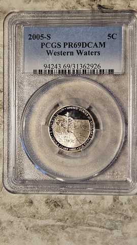 The 2005-S 5C Western Waters Jefferson Nickel, certified as PCGS PR69DCAM, is a high-grade proof coin from the United States Mint's "Westward Journey" series. This specific grade indicates a near-perfect coin with deep cameo contrast.