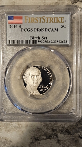 The FIRSTSTRIKE R 2016-S 5C PCGS PR69DCAM is a 2016 Jefferson Nickel minted in San Francisco, certified by the Professional Coin Grading Service (PCGS) with a near-perfect grade of Proof 69 Deep Cameo. The "First Strike" designation indicates the coin was received for grading within the first 30 days of its release.