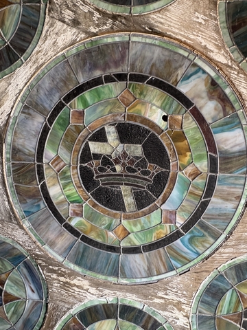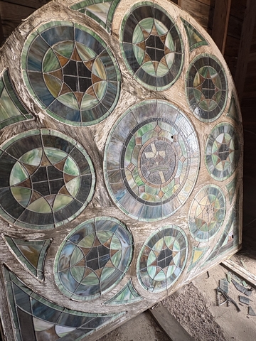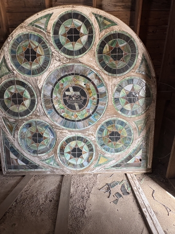 Vintage stained glass church window. Approximately 7'8" x 7'8". Could be cut into separate pieces for individual application.
