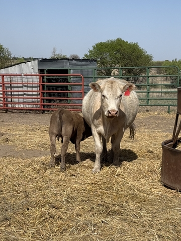 Offering up my 5 year old Red Angus/Charolais cross cow WITH her steer calf.