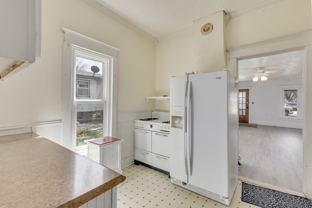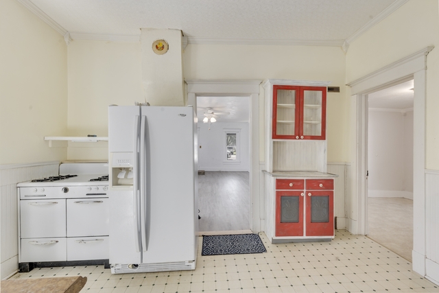 A sunny bump out/bay window sits at the southeast end of the living room and is the perfect spot for a dining table. The 13’ X 9’ vintage kitchen includes an original enameled deep double sink, a working gas stove and a refrigerator. A 9’X 4’ pantry off the kitchen has plentiful food storage and shelving, a new floor, and original period-style medicine cabinet.