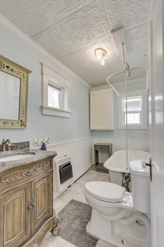 An oversized Jack and Jill closet (3’10” X 9’6”) separates the two bedrooms: one bedroom is 11’6” X 10’ and the other is 9’6” X 11. There are plenty of shelves and clothes storage space in the closet. The 9’6” X 5” bathroom includes a vintage bathtub, a sink, a toilet, and a separate gas heater.