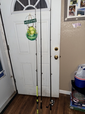 Lews Laser HS Speed Stick 6'10" medium baitcast rod. 2 Shakespeare Ugly Stick Lite pro spinning rods 6'6" medium. Abu Garcia Silver Max spinning reel.