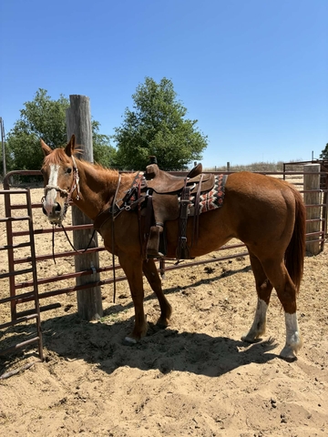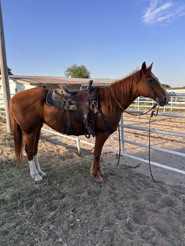 "Sasha" 13yr old grade sorrel mare, kid and begginer broke!!! 100% sound and healthy no lameness issues nor soreness. Stands tied to get saddled, for farrier, loads and unloads, perfect for your little kids to start learning off or even a begginer who's barely learning to ride, has been done plenty of trail riding and ranch work! will go across anything without a spook. For more info 213-321-2389