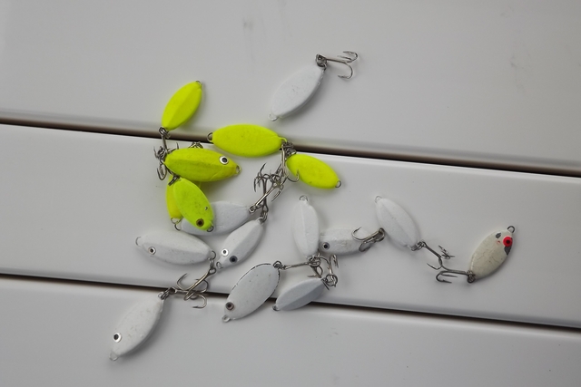 16 slab spoons, 5/8 oz and 1-1/8 oz. All have nickel plated treble hooks, some have eyes. $15.00 for all.