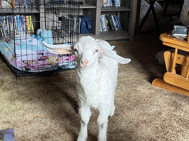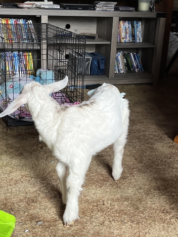 I am needing to find a home for this beauty. She is 2 months old, a mix of Nigerian/boar/nubian, very friendly and loveable(she loves snuggles!), currently bottle fed cows milk and eating hay, no horns, needs cdt. $100